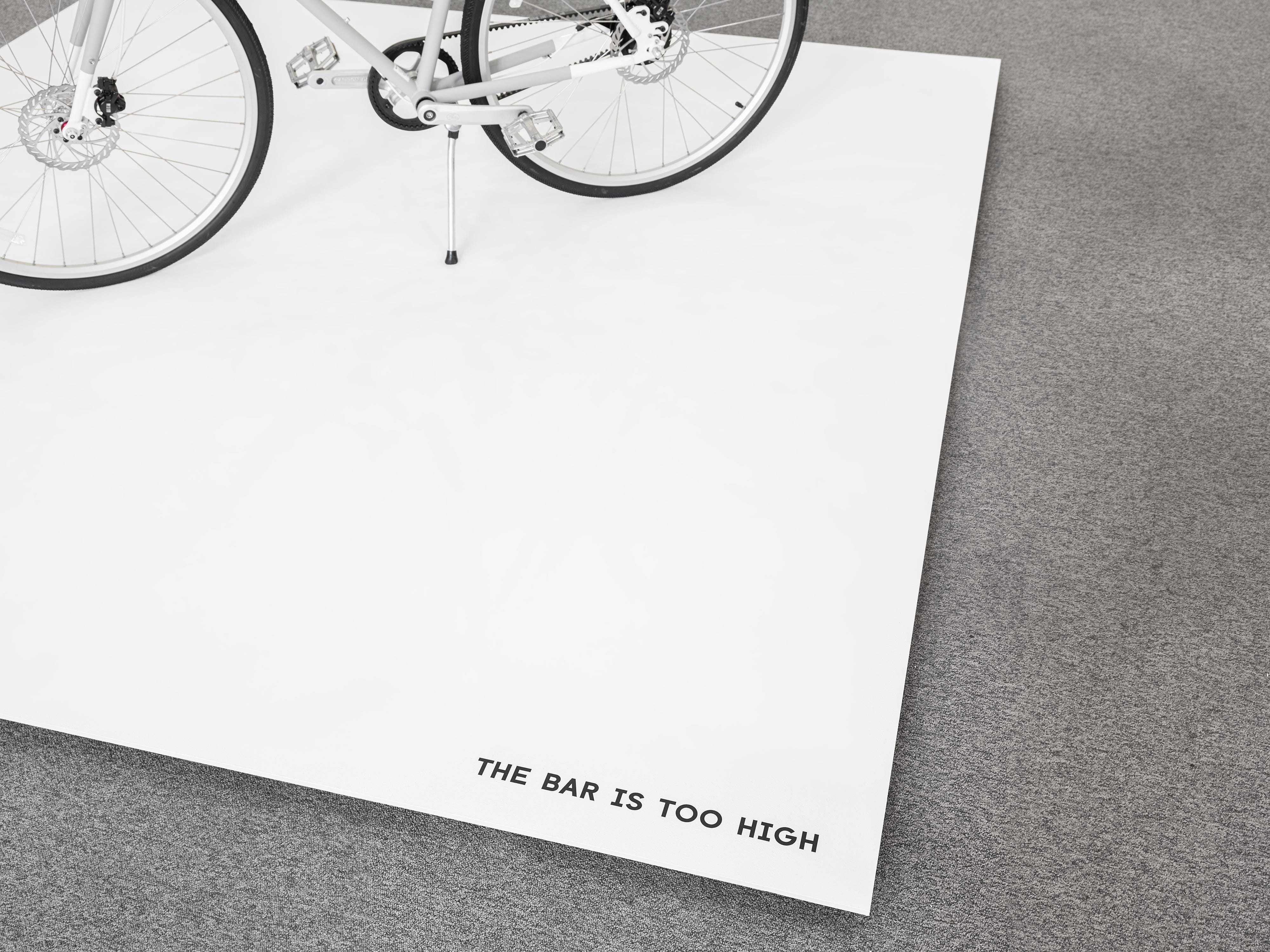 The exhibition centres around a single object: a sleek, pristine bicycle elevated on a pedestal. It was bought on impulse. It’s the wrong size. It can’t be ridden. Quite literally, the bar was too high. Now, stripped of function and transformed into an aesthetic object, the bike becomes a stand-in for every irrational decision, every useless purchase, every attempt to buy meaning. In short: it’s perfect.